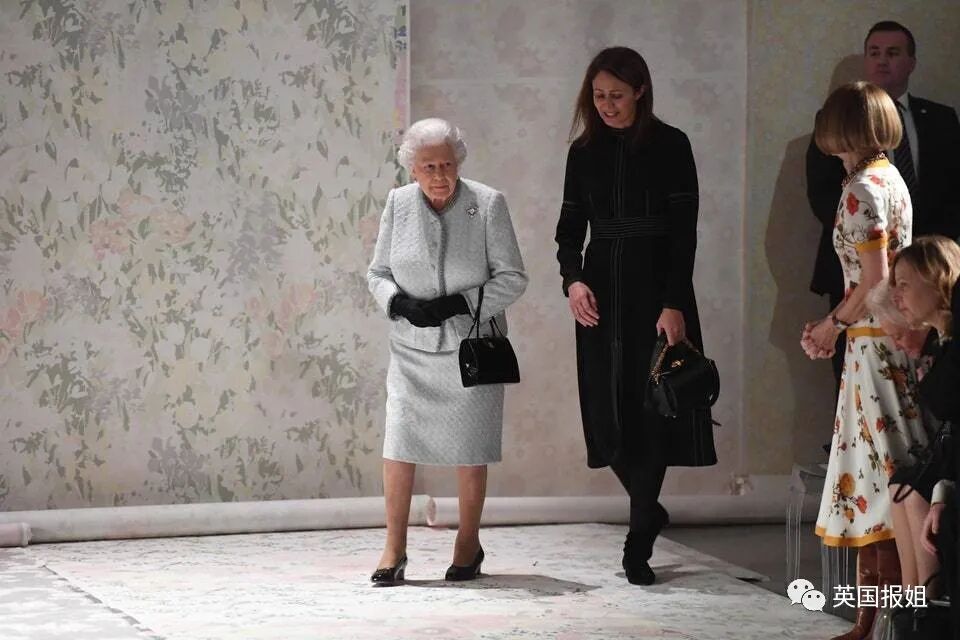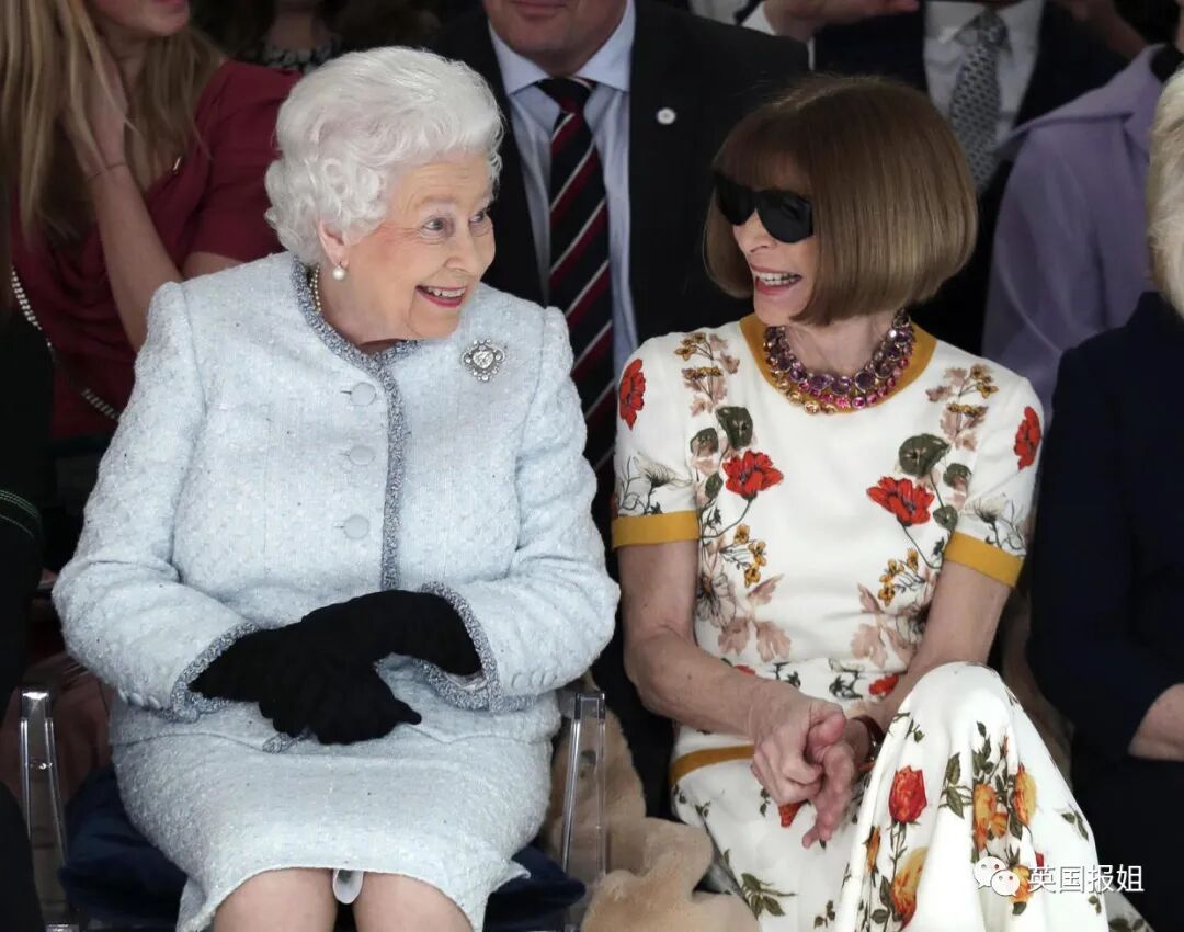 2018年,女王首次造访伦敦时装周,身着淡蓝色粗花呢西装套装,“时尚女魔头”安娜温图尔坐她旁边也不敢冷脸了。