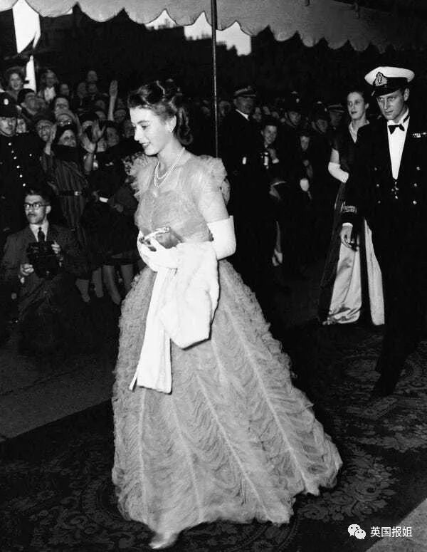 和当时的未婚夫菲利普一起出席晚宴,这件羽毛长裙穿在她身上娇俏又华丽。