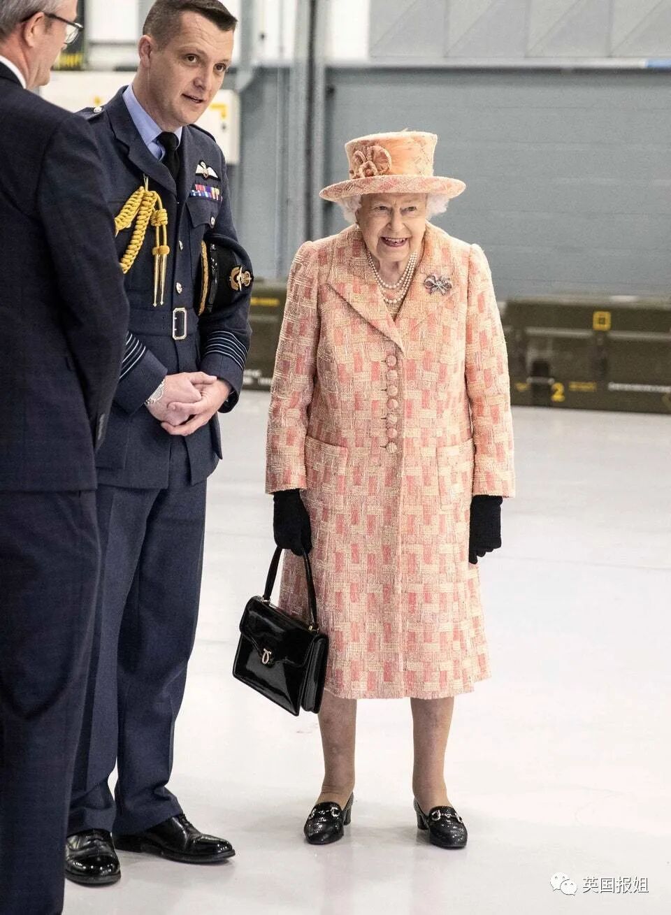 2020年,女王参观皇家空军基地,穿了一身浅桃色套装。