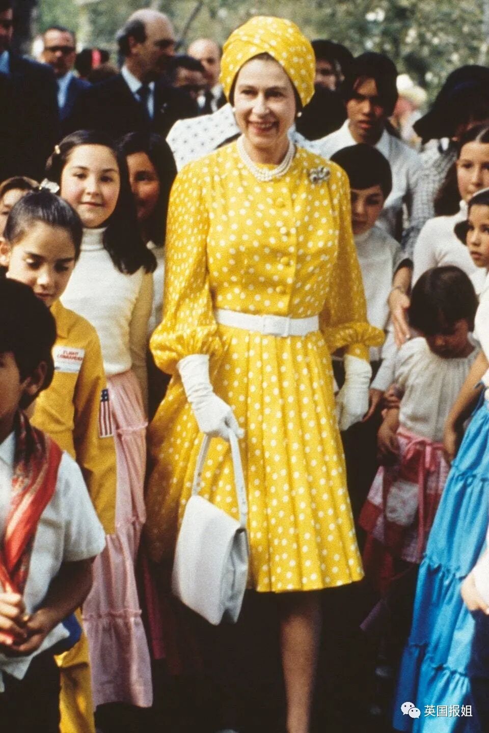 1975年,在墨西哥和一群当地儿童共度时光,这条黄色波点百褶连衣裙就是人群中最亮的星。