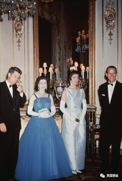 1961年,当时的美国总统约翰肯尼迪和妻子杰奎琳肯尼迪访问英国时,杰奎琳和女王的礼服“撞色”,两人都穿了蓝色,只是深浅不同,看上去很有爱。