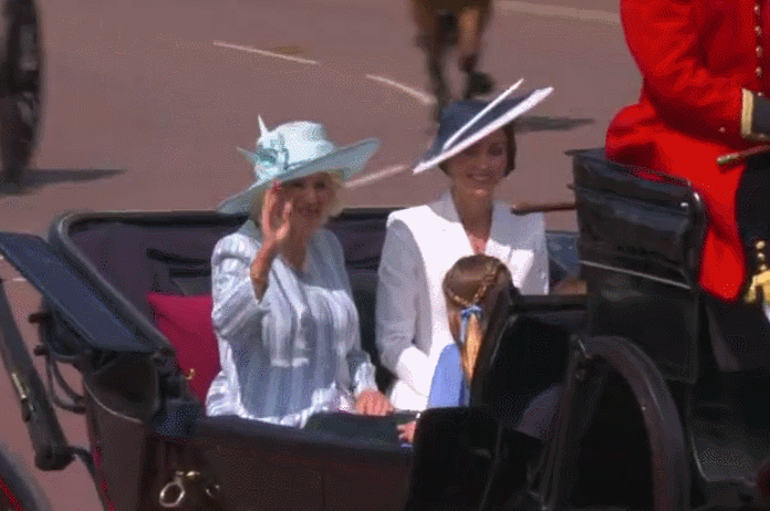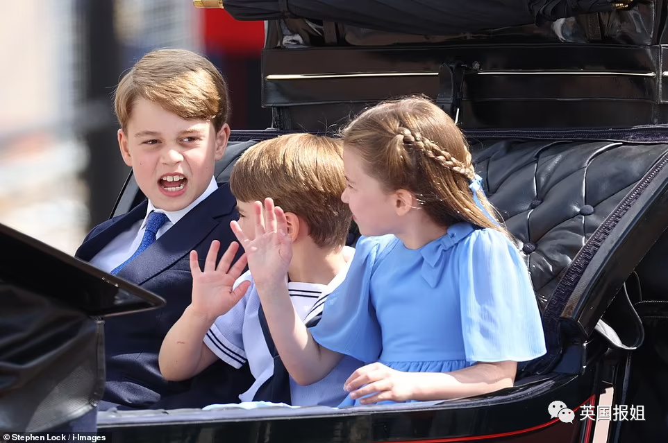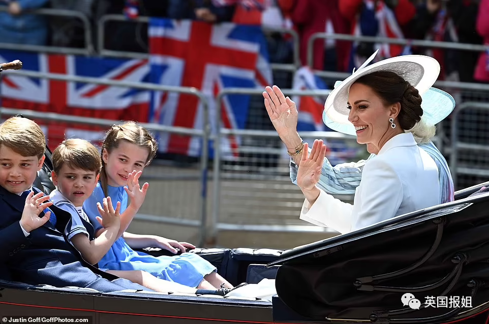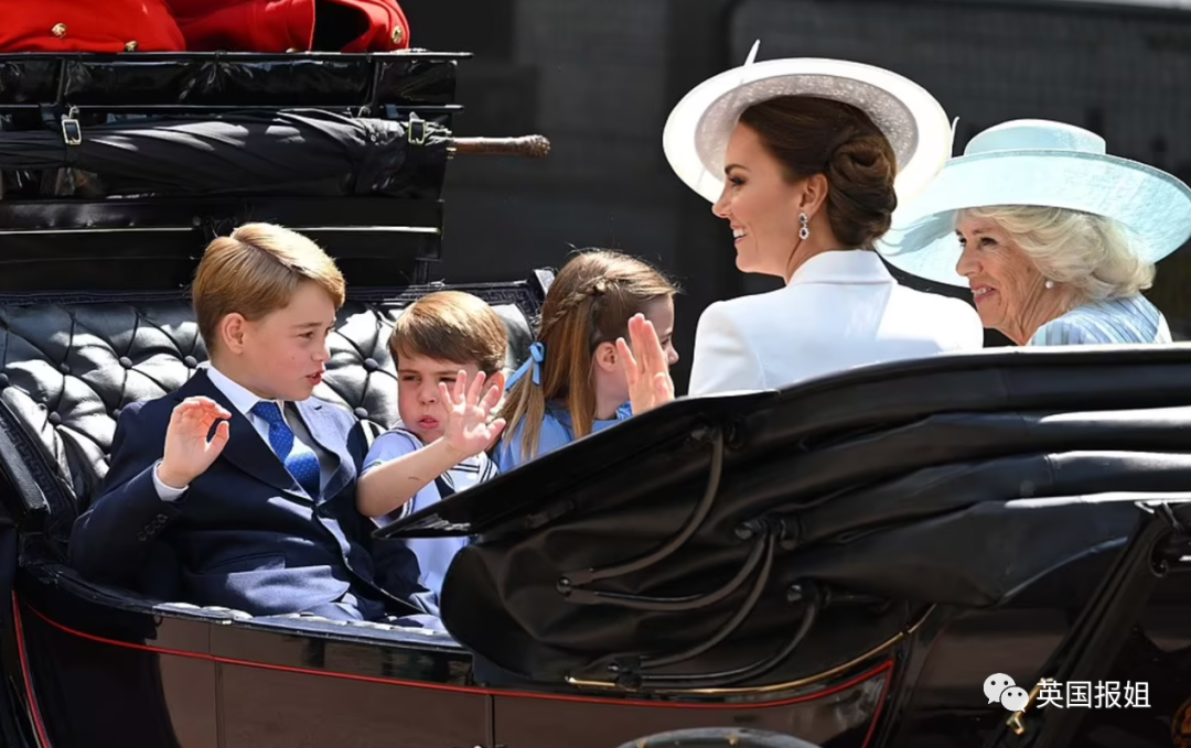 第一架马车上,坐着未来王后卡米拉和凯特王妃,对面是凯特王妃和威廉王子的三个娃:乔治小王子、夏洛特小公主、路易小王子。