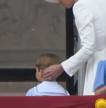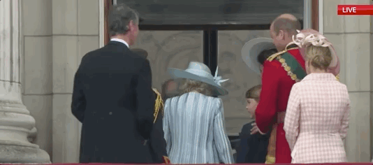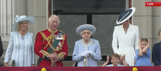 过了中午12点,阅兵队伍走到白金汉宫附近,王室成员也回到白金汉宫。