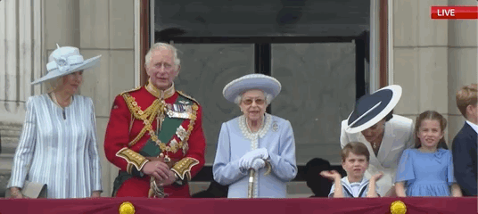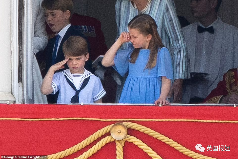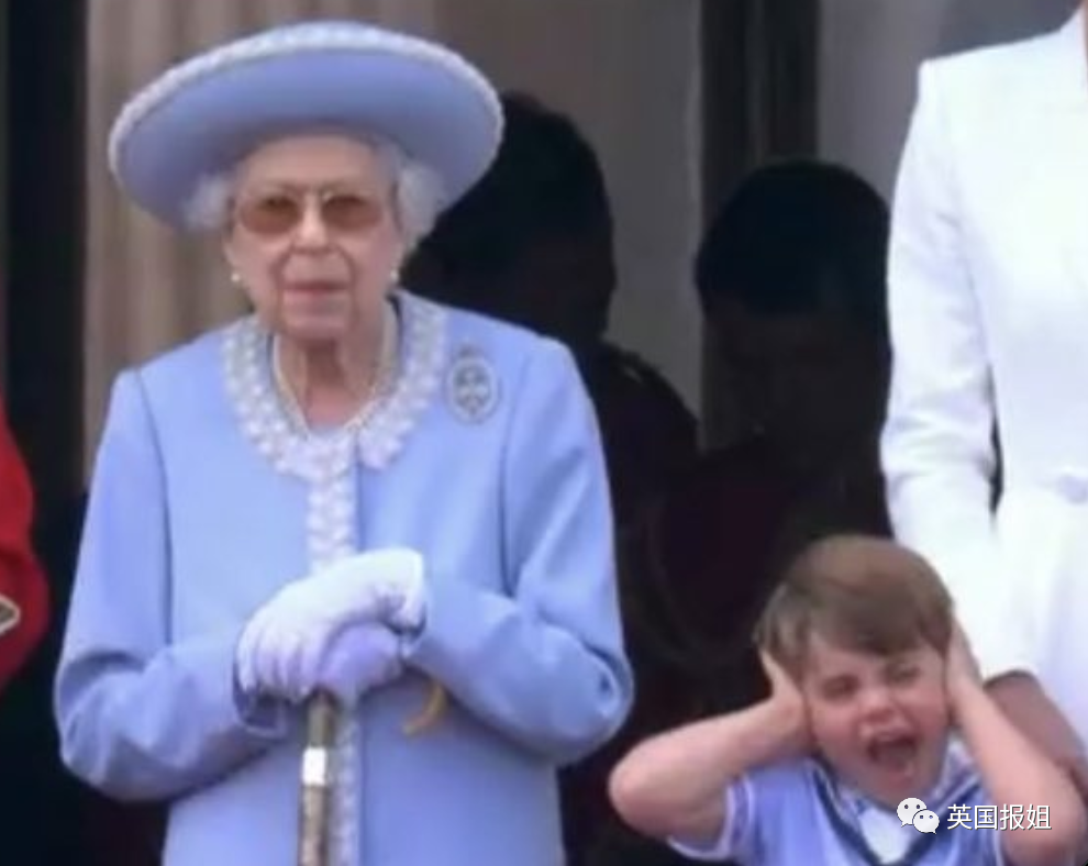 而此时,人群惊喜的发现,穿着浅蓝色套装的女王短暂地出现在阳台上,观看阅兵仪式。