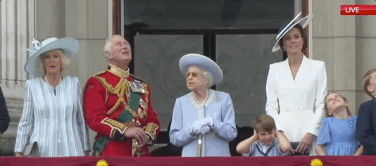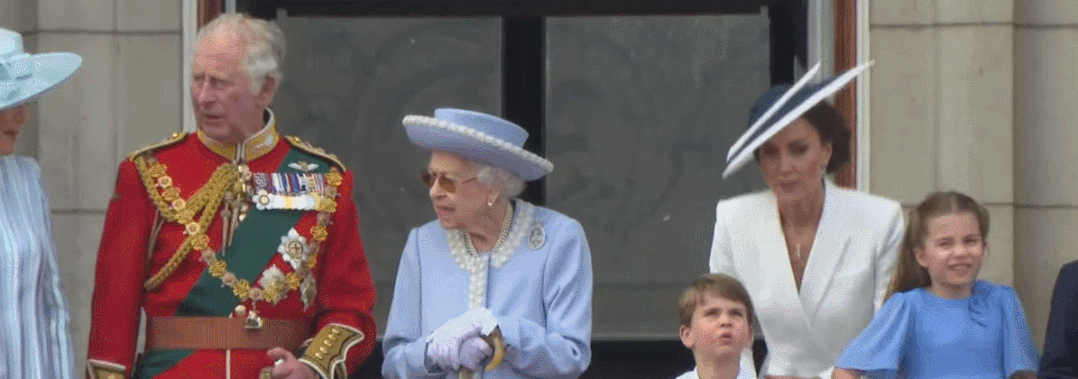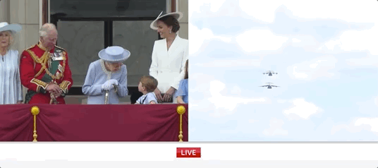 这也是阅兵仪式的一大亮点——女王抬头看飞机,而民众抬头看女王。