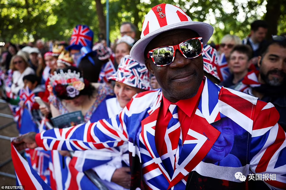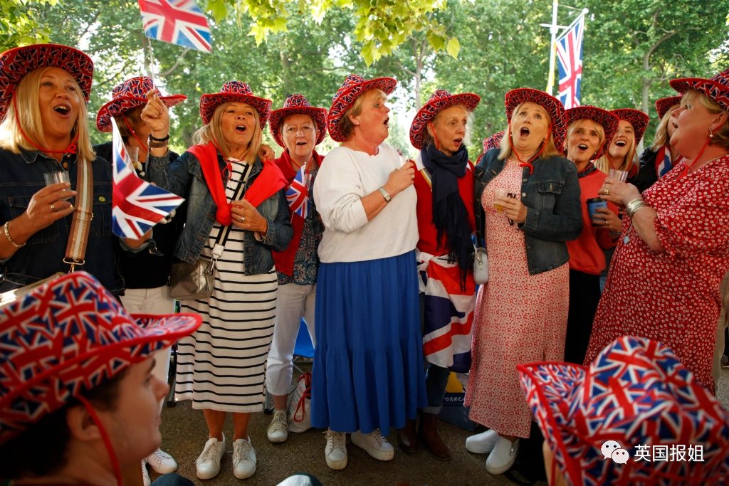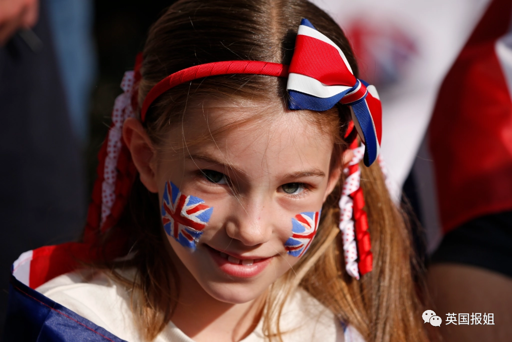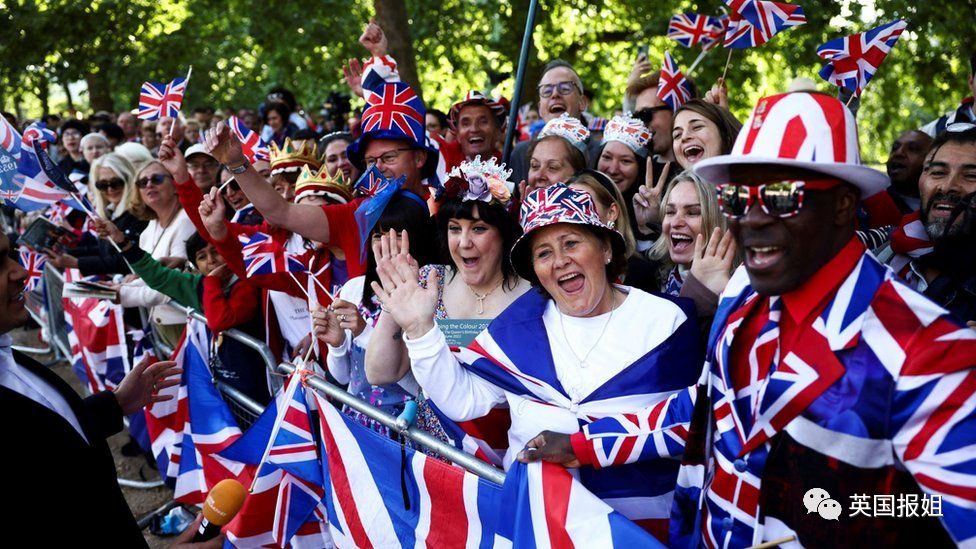 人们穿戴着英国国旗为主题的帽子、衬衫和装饰,精心打扮。