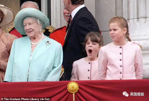 1998年,安德鲁的二女儿尤金妮和姐姐一起看庆典,无奈太困了,即使是身处王太后左右,也是哈气不停: