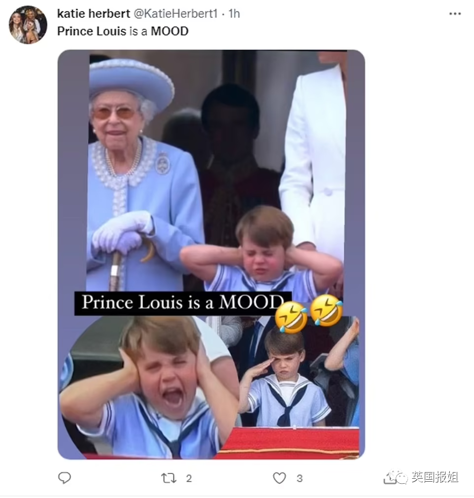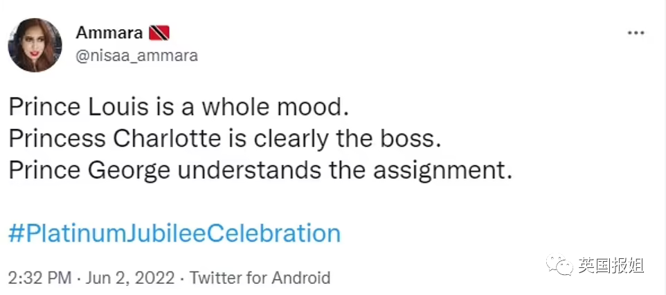 “路易斯王子就是看庆典的我本人,夏洛特公主显然是家里的实权掌握者,乔治王子认真完成了这项任务。”