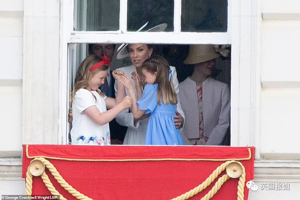 凯特一手带着小儿子路易斯,一手扶着女儿夏洛特,乔治王子和威廉则被挤到了边边上。