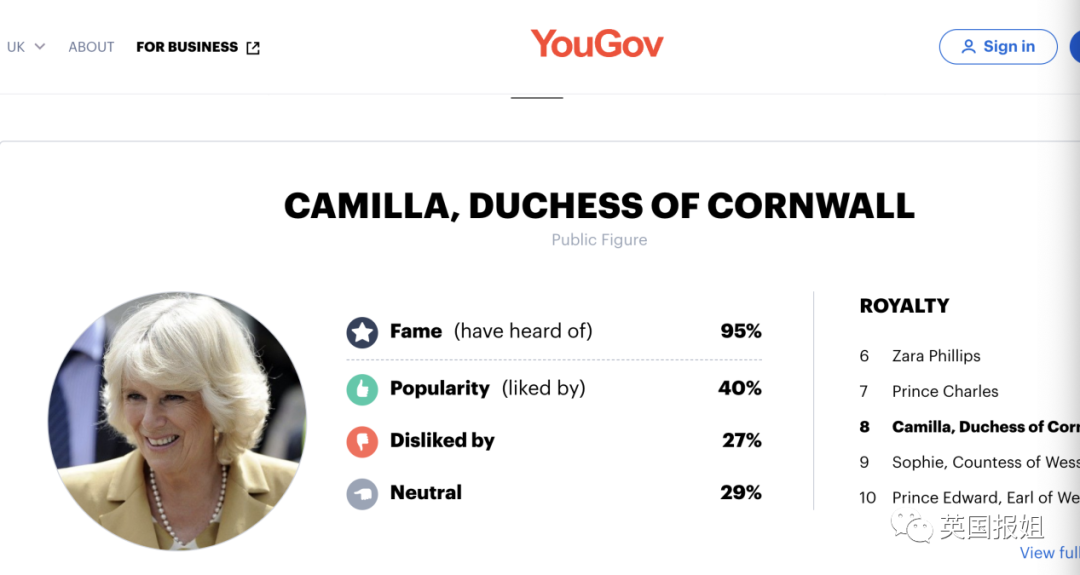 她现在的“好感度”,已经达到了40%,排在王室第八位,高于哈里和梅根。