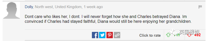 “我才不管谁喜欢她,反正我不喜欢她。我永远不会忘记她和查尔斯是如何背叛戴安娜的。要是查尔斯没出轨,现在戴安娜说不定还活着、儿孙绕膝呢。”