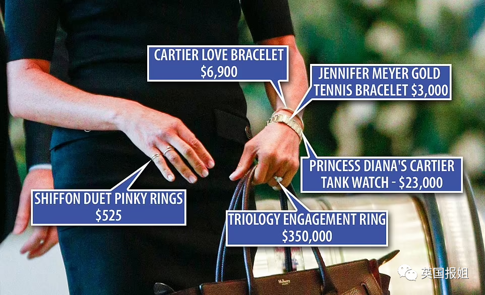 无名指戒指是她与哈里订婚时的那颗,35万美元。这还没结束,左手上还有戴安娜王妃传下来的卡地亚手表,虽说标价是23000美元,但鉴于它有文物属性,可以说是无价之宝了。