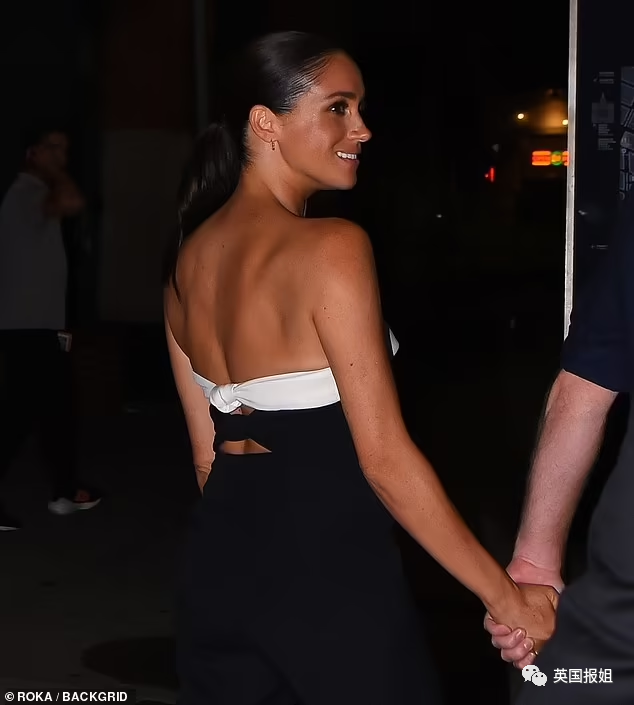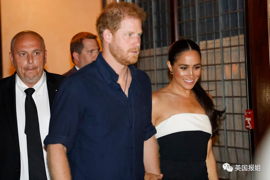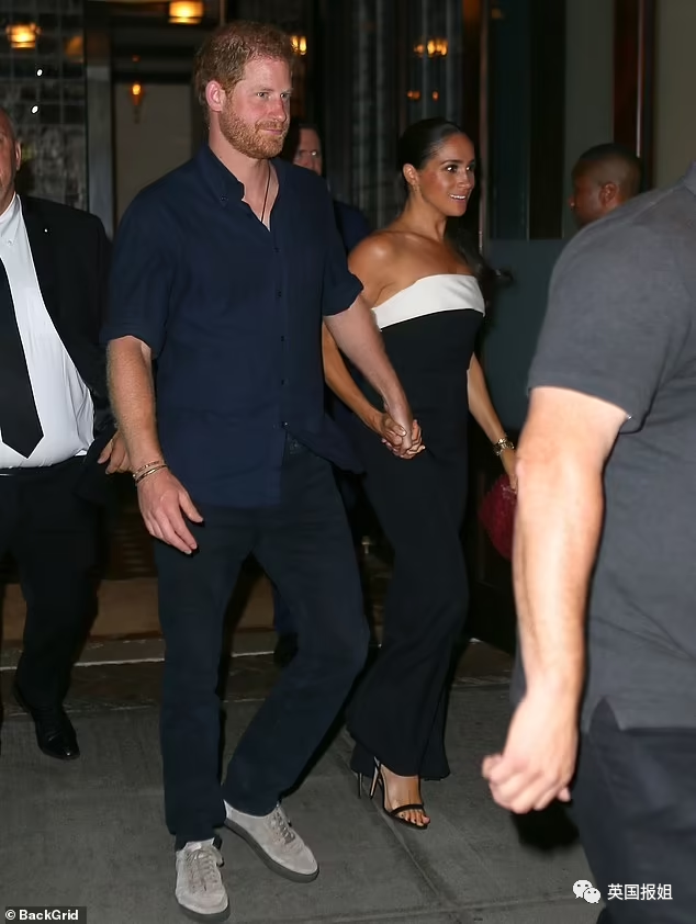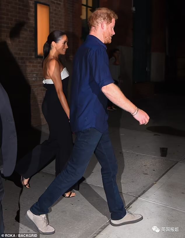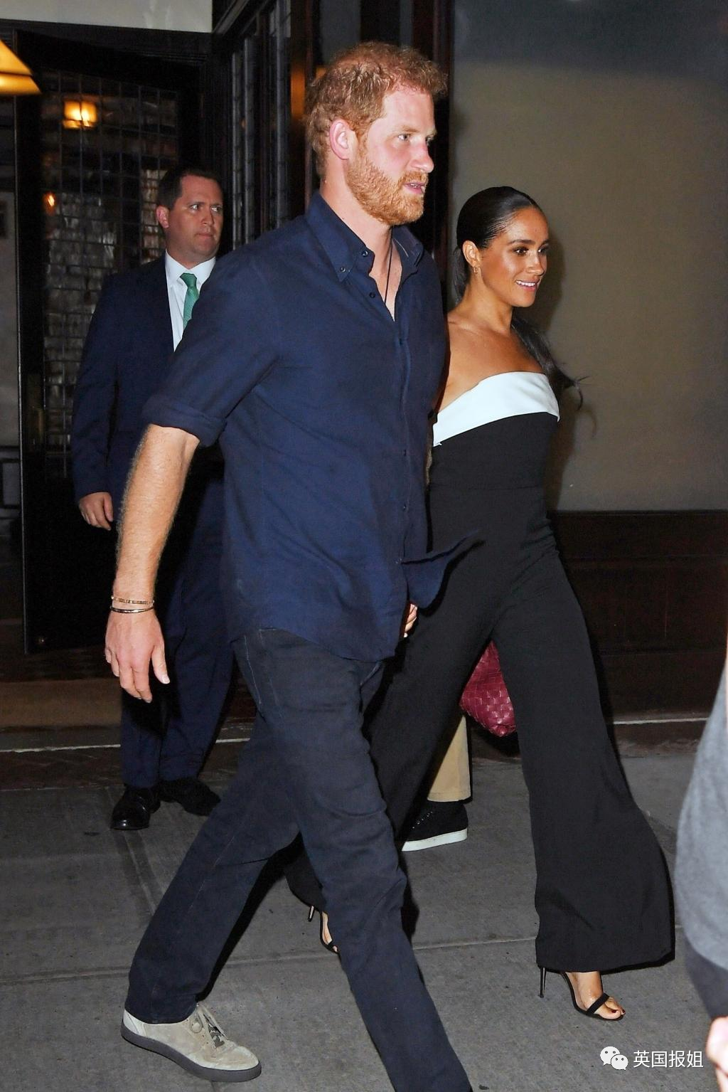 从餐厅出来时,哈里穿着牛仔裤和藏青色衬衫,显得非常随性,但梅根仍然很讲究。