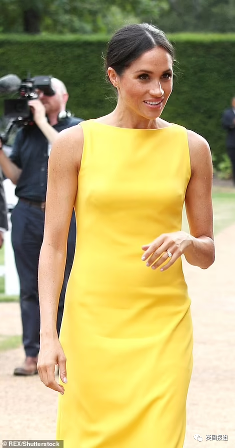 亮黄色的连衣裙,梅根果然还是热衷于一字领无袖的款式。