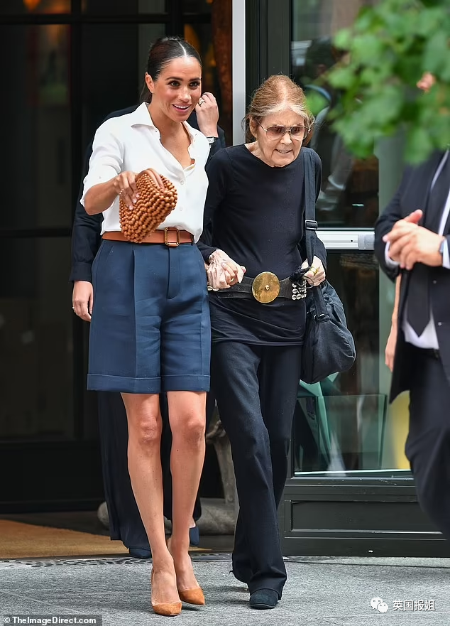 演讲结束了后,第二场活动是梅根单独与美国六七十年代女性解放先驱Gloria Steinem吃饭。她脱下黑色的正装,换上了她平时更喜欢的干练裤装。