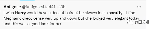 网友对于梅根这套衣服评价很高,优雅体面,梳起来的马尾辫也显得更干练。倒是哈里王子一头乱卷毛和没有好好打理的胡子让英国人吐槽了一番:
