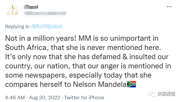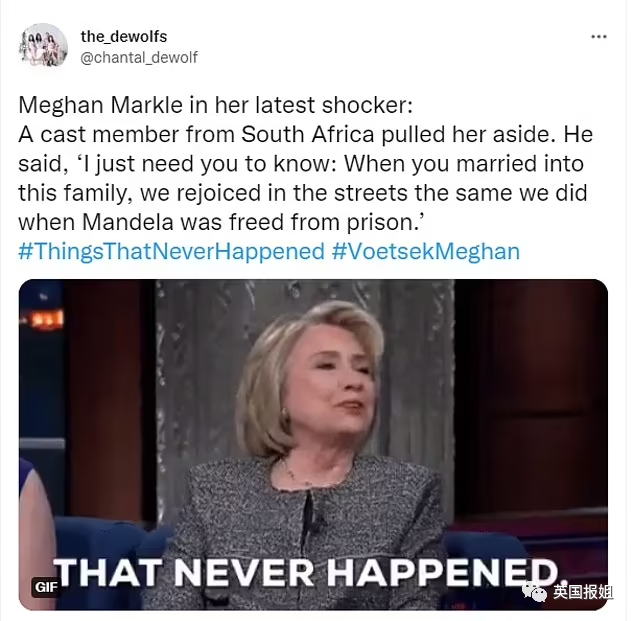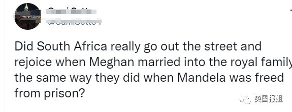 有一名网友求证到:“南非朋友们,你们真的在梅根结婚的时候,像曼德拉出狱时一样欢呼狂欢了吗?”