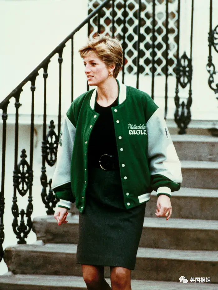 这张街拍还是在送儿子上学的路上被抓拍到的。戴安娜穿着一件超大号的 NFL费城老鹰队橄榄球夹克,内搭一件简单的黑色裙子和T恤,青春美丽。