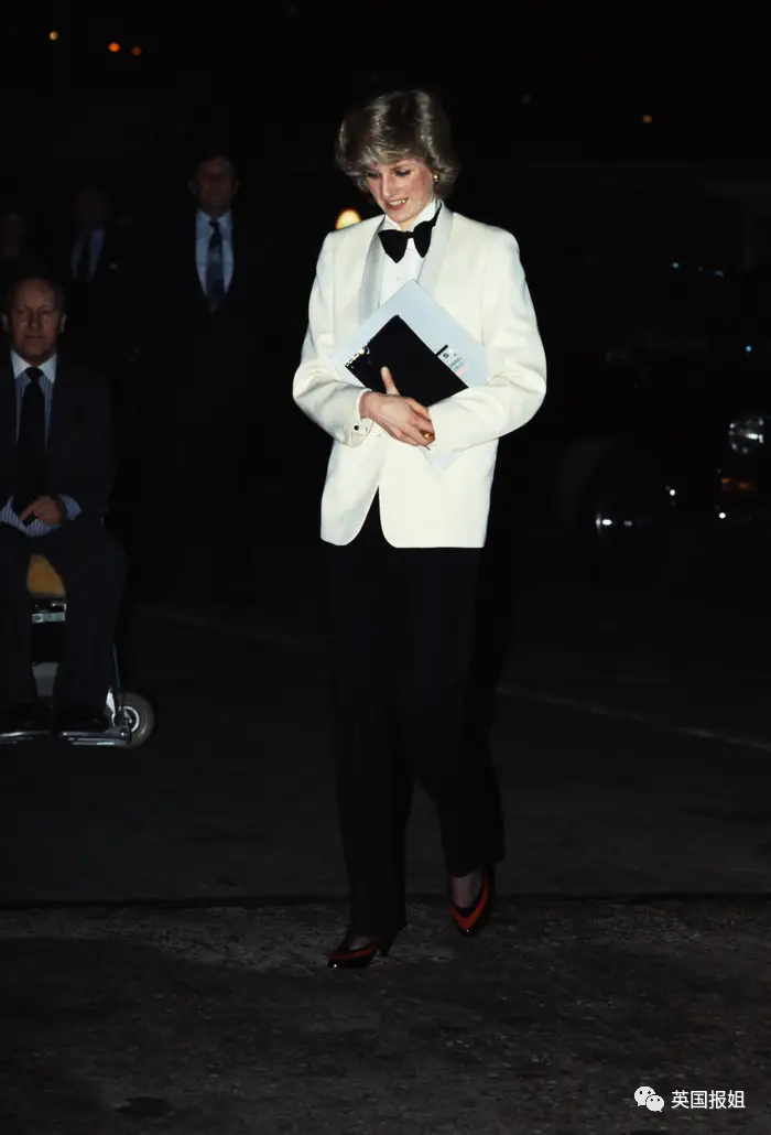 在此之前女性穿裤装会被人为是不正规的,无法进入一些高端场合。而戴安娜早在80年代,就穿着全男装礼服出席活动了。