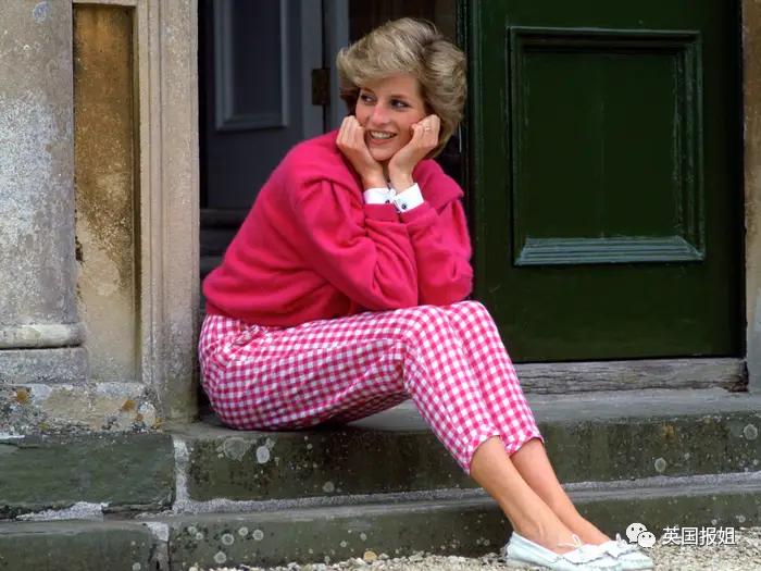1986年,在家休息的戴妃穿着粉色格子9分裤和粉色毛衣,将自己的休闲风格提升到了新的高度。