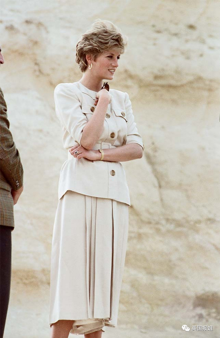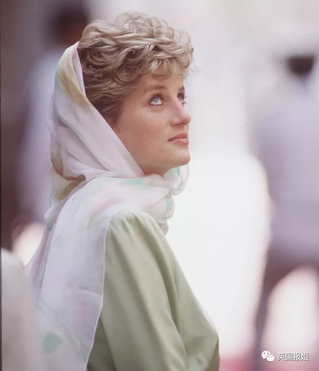 戴安娜1992年的埃及行,穿搭非常成功。先是一套简洁的绿色连衣裙,配上柔软的白色头巾,凸显了纯洁清澈的气质。