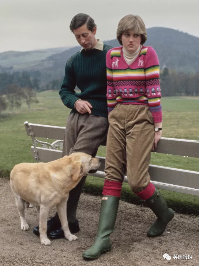 戴安娜和查尔斯订婚后第一次正式合影时,戴安娜也穿了一件可爱的粉色毛衣,搭配灯芯绒裤子和她最喜欢的雨靴。