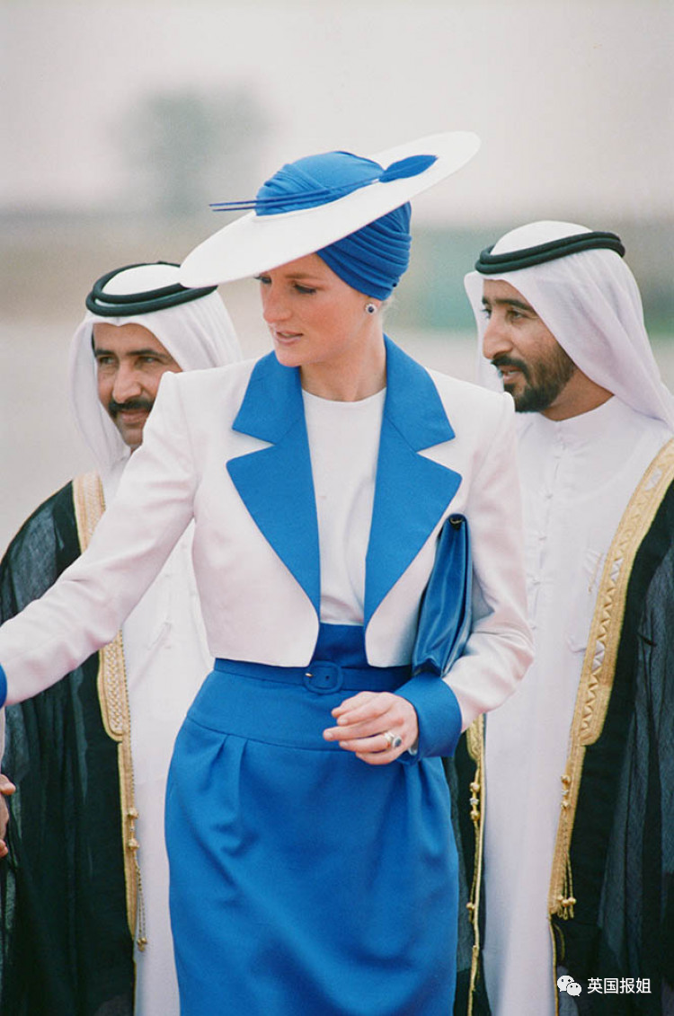 戴安娜在迪拜出访的穿搭也十分惊艳。全身大面积的蓝色色块干净大气,而她没有戴常规的礼帽,而是将礼帽和头巾结合起来,致敬当地文化。