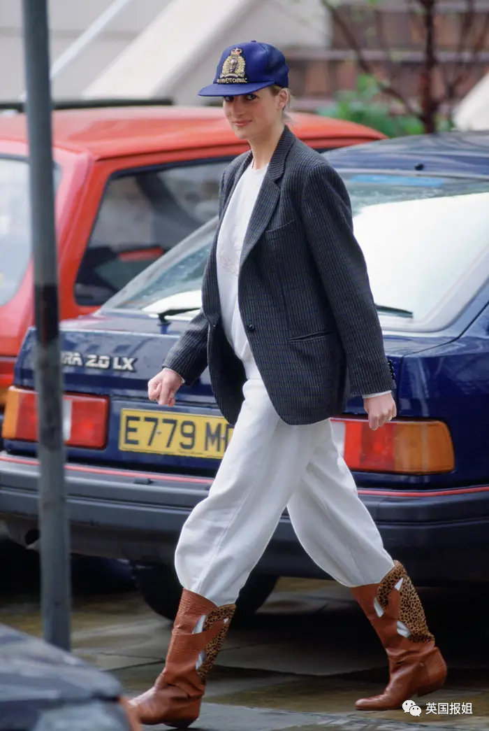 1989 年戴妃送儿子上学,在白色的运动套装外穿了一件格子西装,脚上还是那双皮靴,还有头顶熟悉的棒球帽。这套衣服别人穿不一定好看,但戴安娜穿就很潇洒。