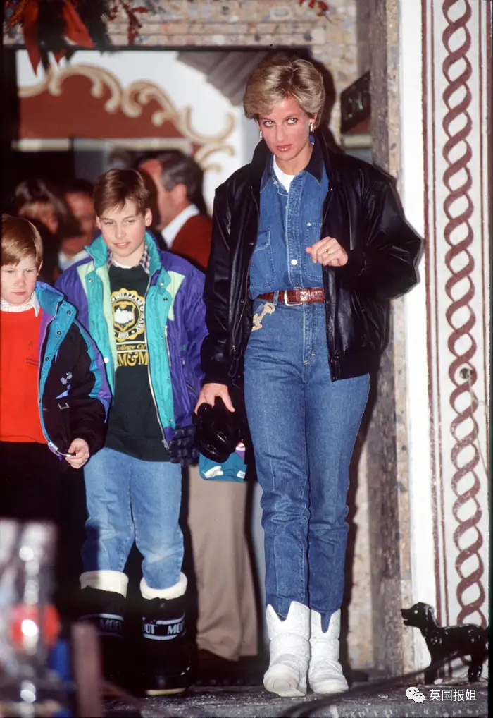 1993年戴安娜和两个儿子一起去滑雪,穿了一套牛仔连体服,搭配了over-size飞行员皮衣和白色靴子,真的很会搭。