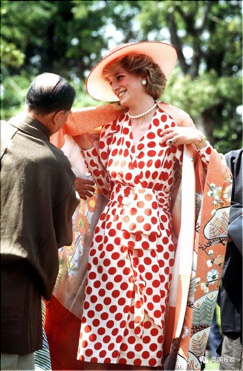 1986年访问日本时期,戴安娜身穿红色波点裙,搭配了一顶镶红边的礼帽。这件裙子现在看仍然很时尚。