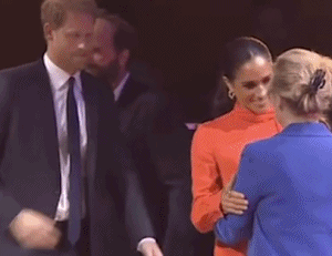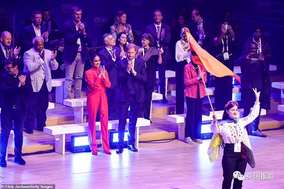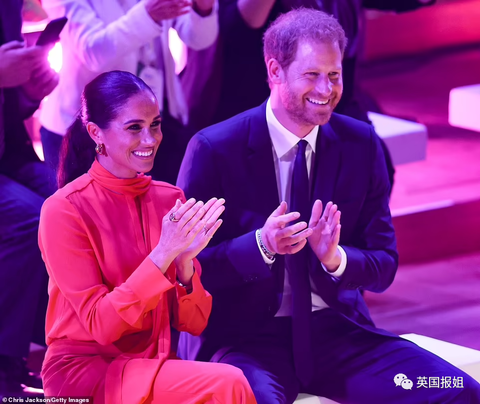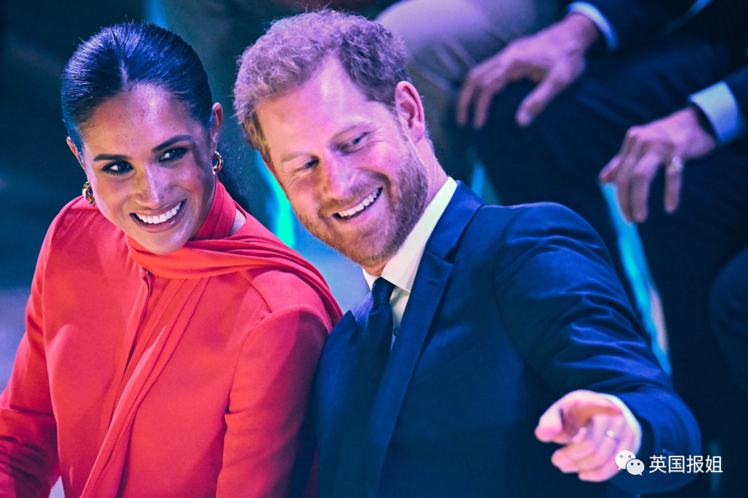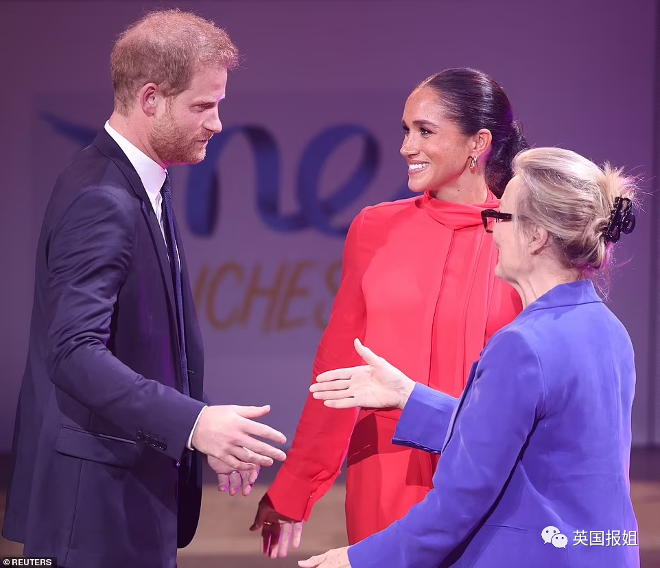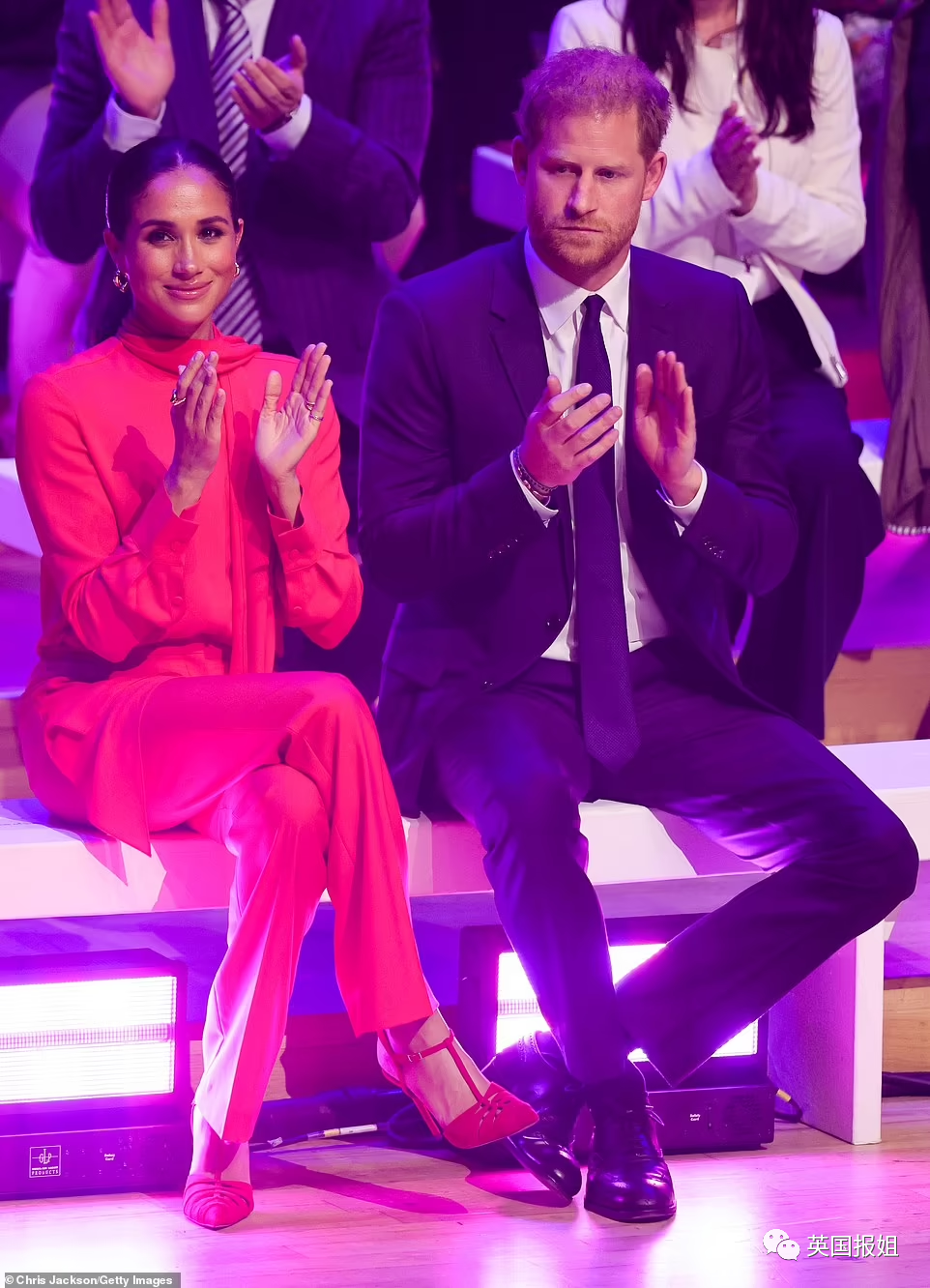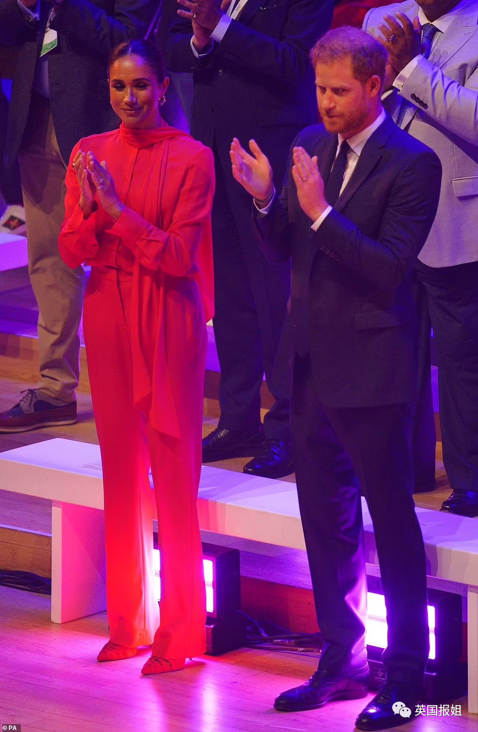 梅根在这次活动中是主角,而哈里是配角,在入场时哈里也有点迷迷糊糊的,在妻子的引导下和嘉宾们打招呼。