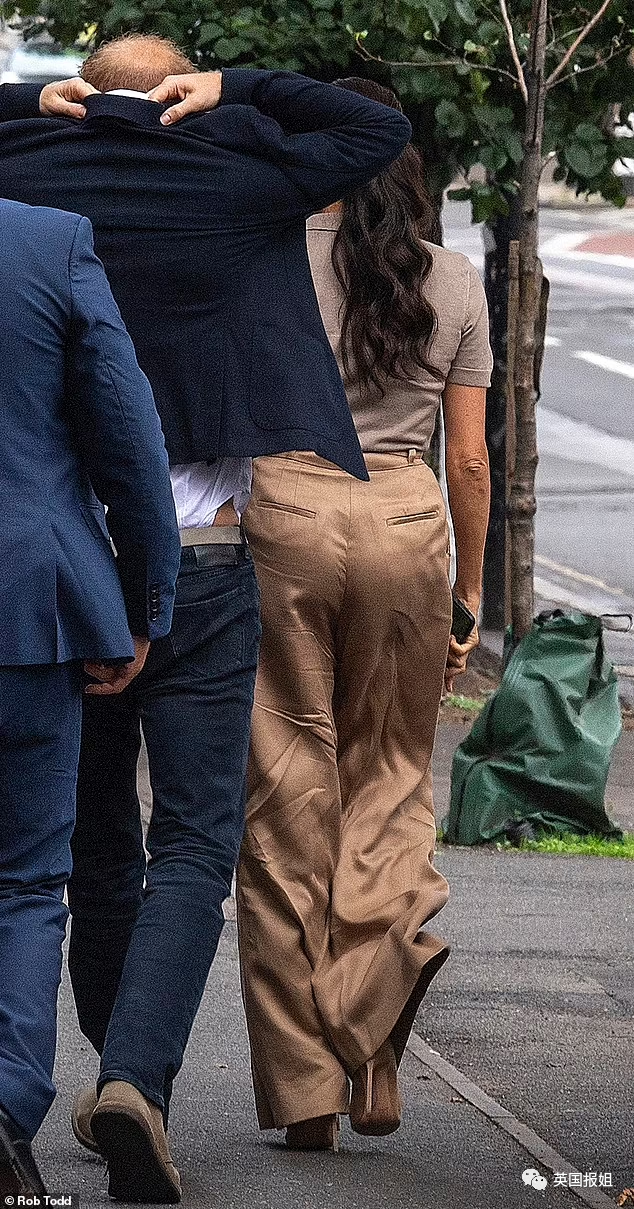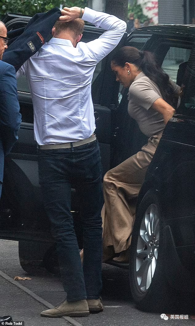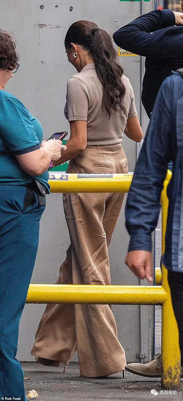 梅根出发时穿着价值735英镑的羊绒POLO衫,搭配同色系阔腿长裤,和760英镑的Manolo Blahnik高跟鞋,看起来非常潇洒。