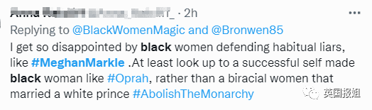 这话的本意是在暗示英国王室歧视黑人,但美国黑人听众听了也不舒服。觉得她因为有白人血统,所以是站在拥有了白人特权的基础上,说着“从小没受过歧视”这样的风凉话,显得很不知人间疾苦。