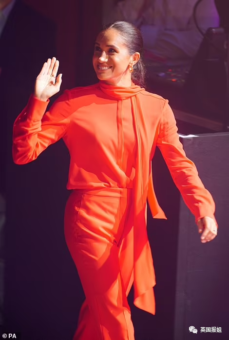 活动现场梅根换上了一身耀眼的大红色套装。上衣是来自Another Tomorrow的471英镑的衬衫,裤子541英镑,对于梅根来说,这次她难得选择了比较“平价”的服装参加这么大的盛会。