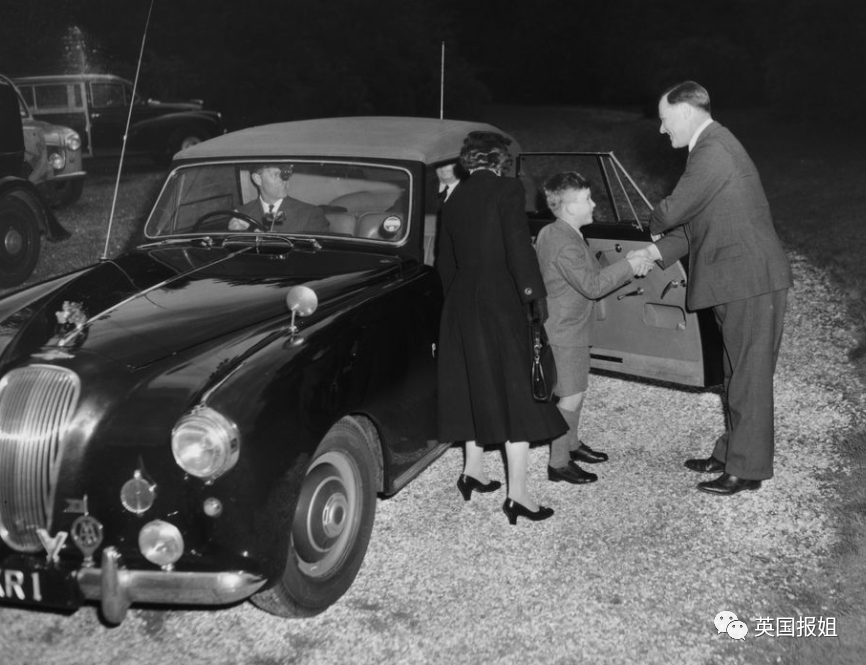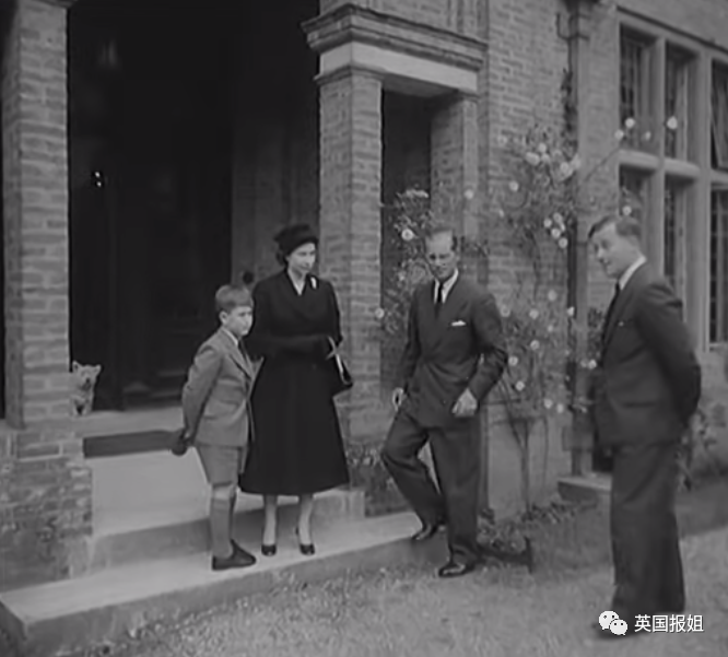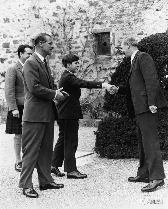 1957年9月23日,女王和菲利普亲王带着8岁的查尔斯王子去上学,也是校长出来迎接,当时还是黑白照片。