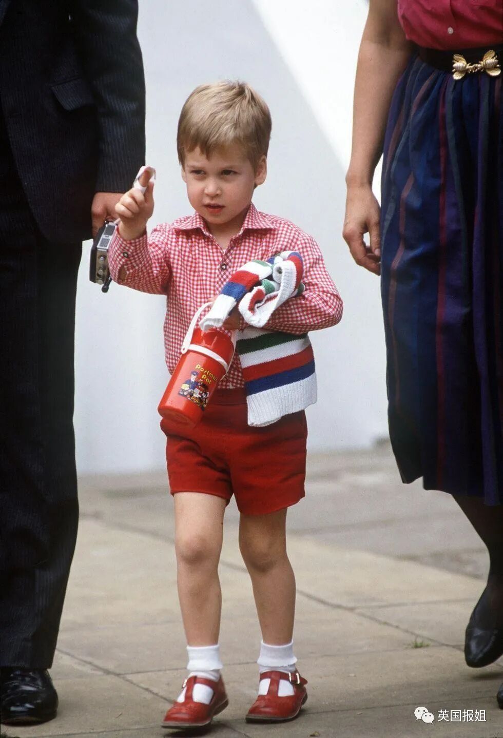 1985年9月24日,第一天来到托儿所的威廉王子,全身穿着都是红色系的,红白格子衬衫、红色小短裤,还有小红鞋、小红水杯。
