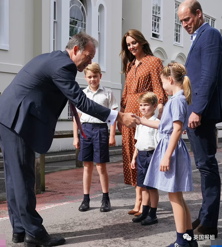 和校长简短交谈过后,一家人便进了学校,9岁的乔治、7岁的夏洛特和4岁的路易斯将会进入不同的年级。