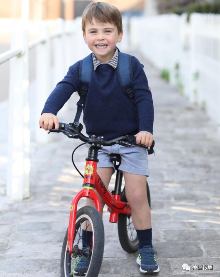 最年幼的路易斯王子是最晚去幼儿园的,第一天上学的认证照片有点特别,不是站着或坐着,而是骑了辆小单车,脸上带着大大的笑容,一看就很讨喜。