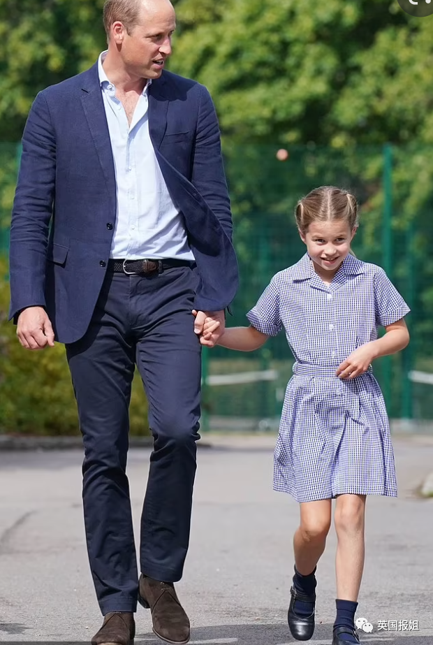夏洛特则穿了一身蓝白格子的夏季连衣裙,走在旁边和爸爸威廉手拉手。