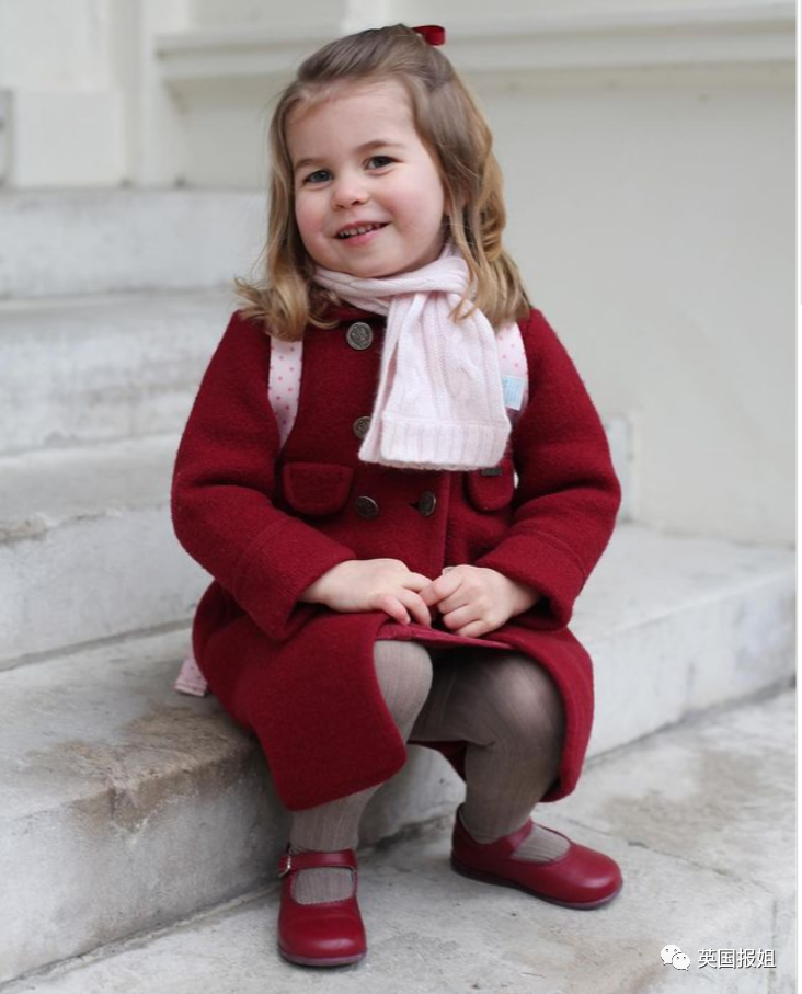 到了夏洛特小公主上幼儿园的时候,这张穿着红色小外套的夏洛特第一天上学照片,萌翻了全世界。