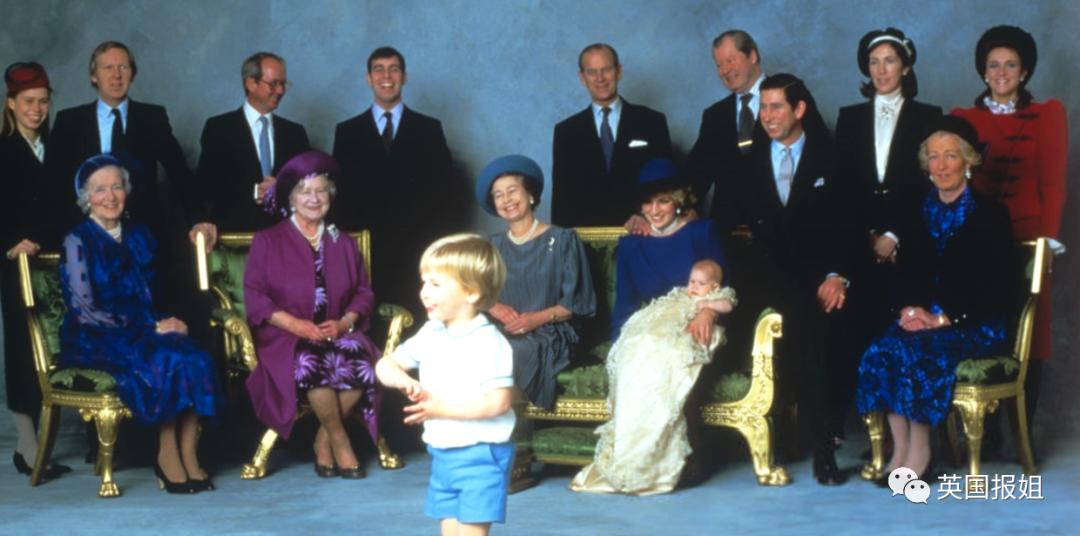 1984年,查尔斯的第二个孩子哈里接受了传统的王室新生儿受洗仪式,哈里穿着维多利亚时代传下来的受洗裙,威廉在摄像机前乱跑。此时的王室,已是四代同堂。