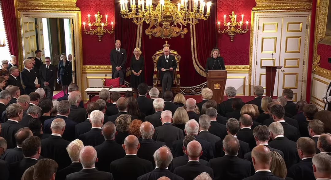 当地时间9月10日上午,圣詹姆士宫举行了历史性仪式——王位继承理事会。这是首个全程电视直播的王位继承仪式。查尔斯在此正式宣誓,登基成为英国新君主。