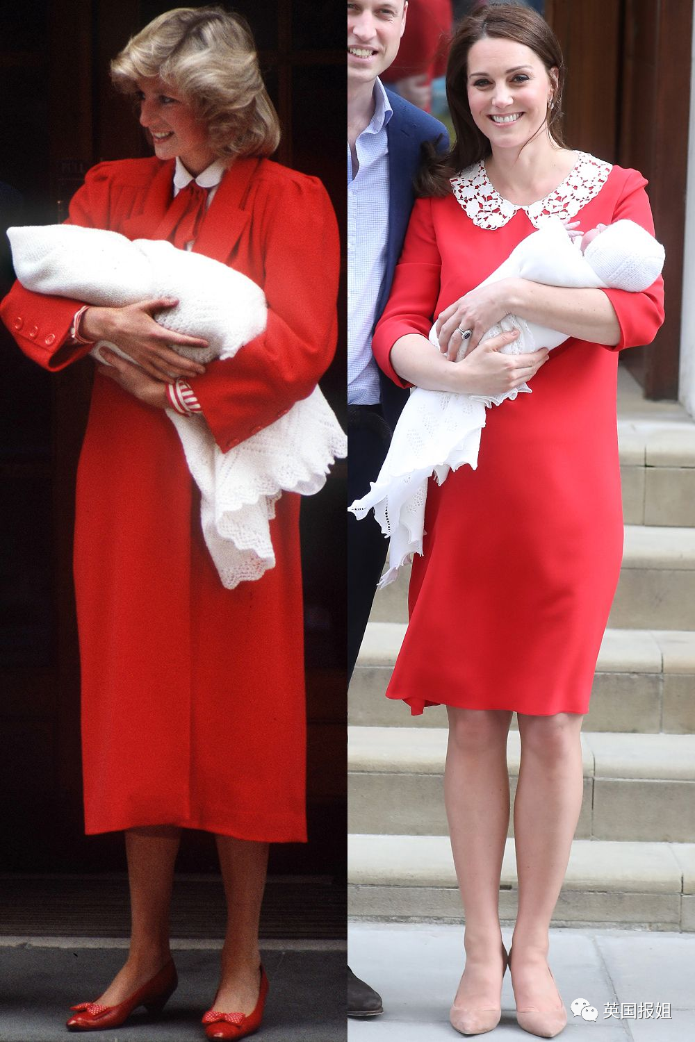 凯特分娩后,第一次抱着路易小王子在公众面前亮相的穿搭,也是在致敬当年戴安娜抱着威廉的样子,选择了一样的白领红裙。
