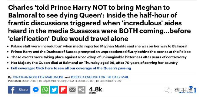 “查尔斯告诉哈里,在这个极度悲伤的时刻,让梅根待在巴尔莫勒尔城堡是不对的,也不合适。
