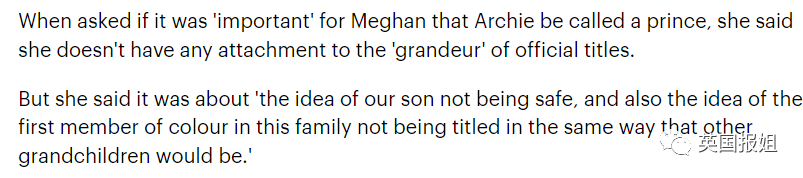 梅根曾经在奥普拉采访中暗示,王室拒绝给予阿奇“王子”的头衔,是因为他是她的孩子,是一个“混血儿”。