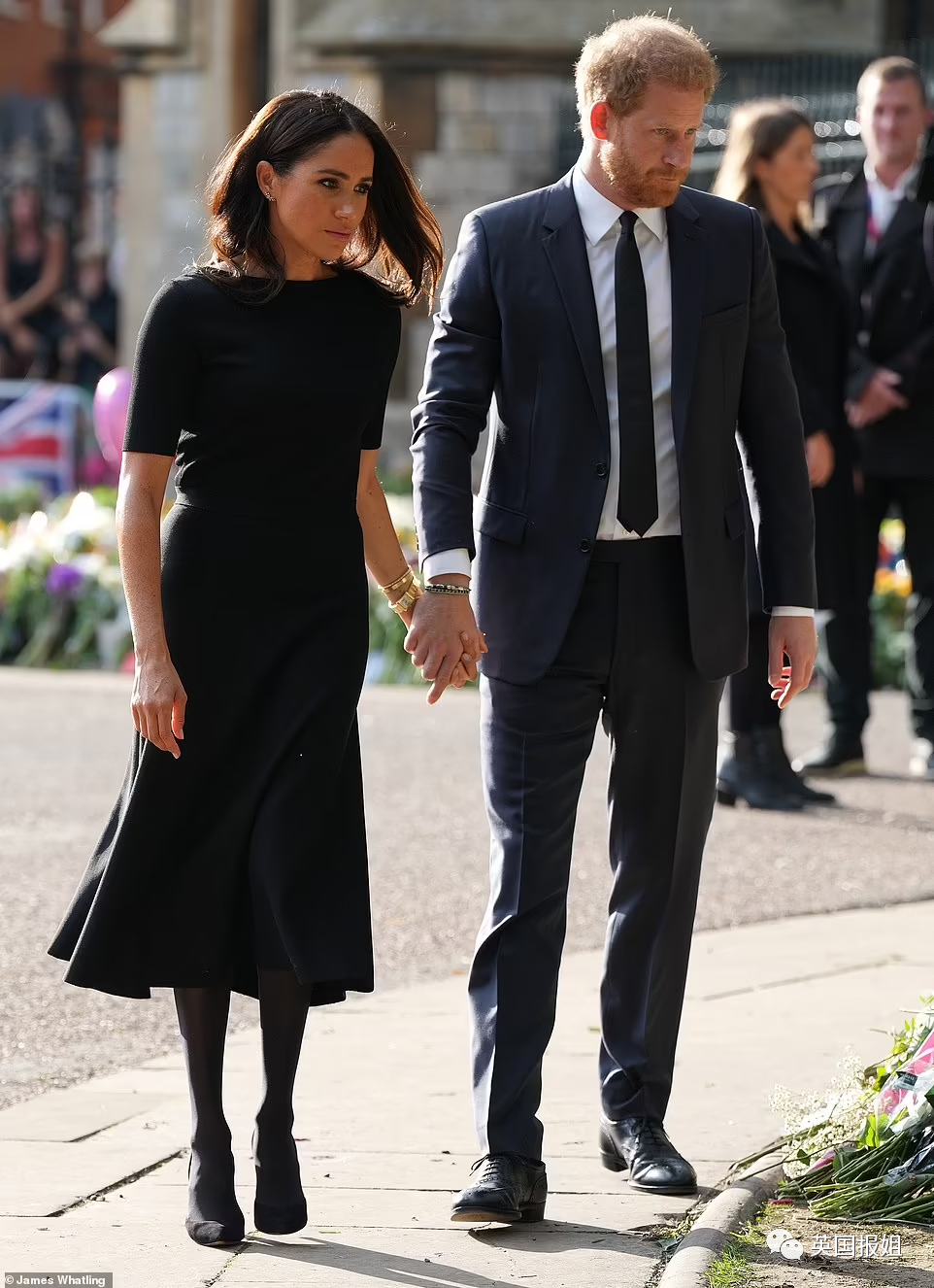 他们只是各自与民众握手交谈,阅读民众哀悼花束上面附上的卡片,一起纪念女王。