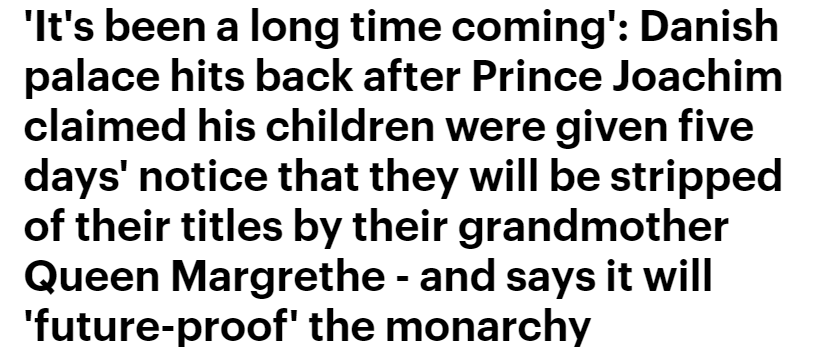 从2023年1月1日起,约阿希姆王子殿下的后代将只能使用蒙佩扎(Monpezat)伯爵和伯爵夫人头衔,丹麦王子和公主头衔将不复存在。