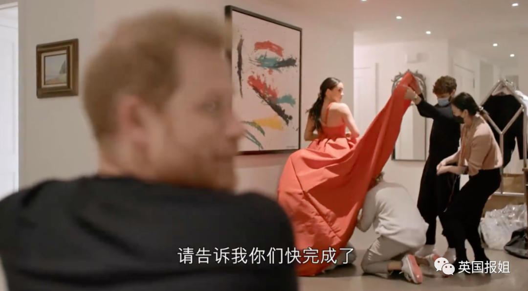 比如,梅根在颁奖典礼后台换裙子,哈里在旁边调侃她:
