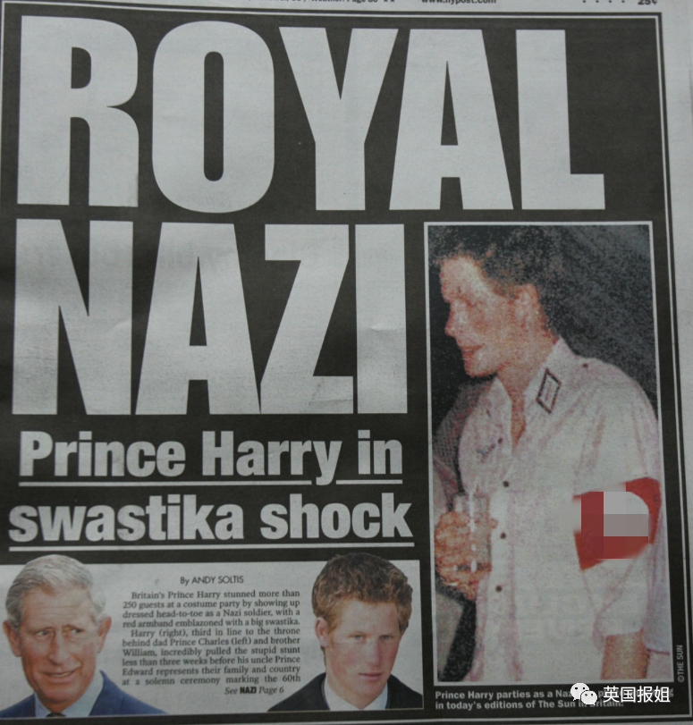 哈里爆料说,威廉凯特在2005年时曾让21岁的他在扮装派对上穿纳粹军服,这件事在当时引爆成一场巨大丑闻。