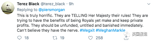 另外网友指出:“这真是太可怕了。他们在“通知”女王自己的规矩!想继续占王室身份的便宜,但又想维持自己的私人利益。他们应该被停资助、剥夺名号、立刻被驱逐。胆子这么大,真是难以置信!#梅根退欧 #梅根马克尔”